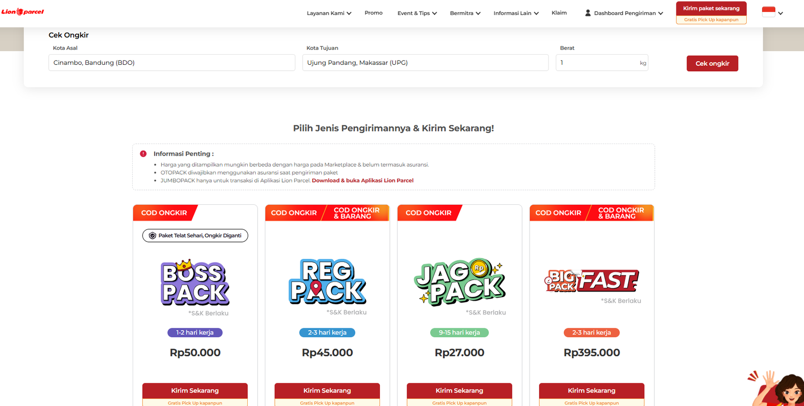 Saya menemukan perbedaan tarif ongkir untuk Lion Parcel.